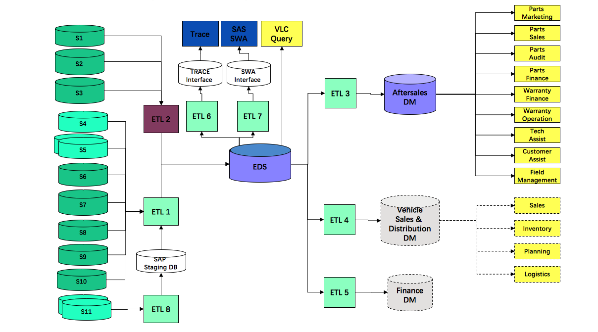这是上海通用汽车的一个数据平台,别看复杂,严格意义上来讲这是一套 EDW 的架构、在 EDS 数据仓库中采用的是准三范式的建模方式去构建的、大约涉及到十几种数据源,建模中按照某一条主线把数据都集成起来