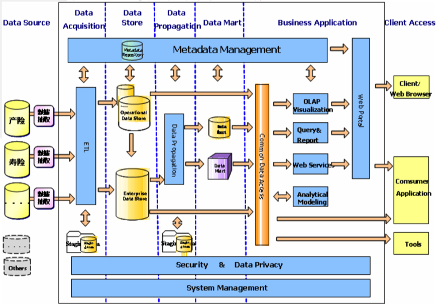这个数据仓库平台计划三年的时间构建完毕,第一阶段计划构建统统一生性周期视图、客户统一视图的数据,完成对数据质量的摸底与部分实施为业务分析与信息共享提供基础平台。第二阶段是完成主要业务数据集成与视图统一,初步实现企业绩效管理。第三阶段全面完善企业级数据仓库,实现核心业务的数据统一。