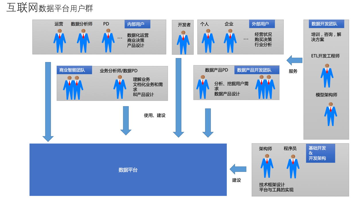 - 互联网数据平台的使用与建设方是来自各方面的人,数据平台又是技术、数据产品推进建设的。