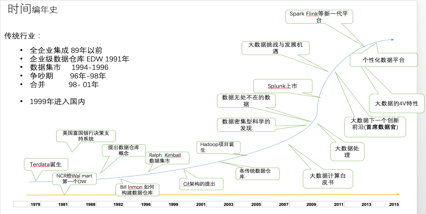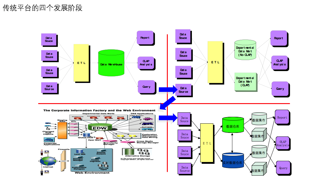 五个时代划分是以重要事件或代表人物为标志,比如说在企业数据集成 EDW 时代其重要代表人物是 Bill Inmon 代表作数据仓库一书,更重要是他提出了如何建设数据仓库的指导性意见与原则。他遵循的是自上而下的建设原则,这个导致后来数据仓库在千禧年传到中国后的几年内,几个大实施厂商都是遵守该原则的实施方法,后来的数据仓库之路等各种专业论坛上针对数据仓库 ODS-EDW 的结构讨论 (备注:坛子里有个叫吴君,他发表了不少这方面的文章)。