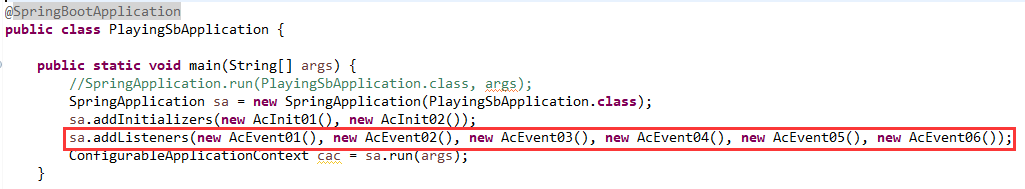 一共有七种事件对象,除去一种是处理失败用的,还剩六种。也就是说我们可以通过六个事件参与到SpringBoot应用的启动中去。