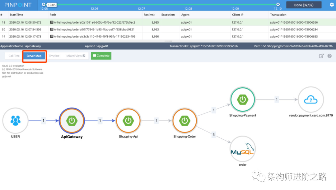 这时就迫切需要一个工具帮我们解决这些问题,于是 APM 全链路监控工具就应运而生了。有开源的 Pinpoint、Skywalking 等,也有收费的 Saas 服务听云、OneAPM 等。有些实力雄厚的公司也会自研 APM。