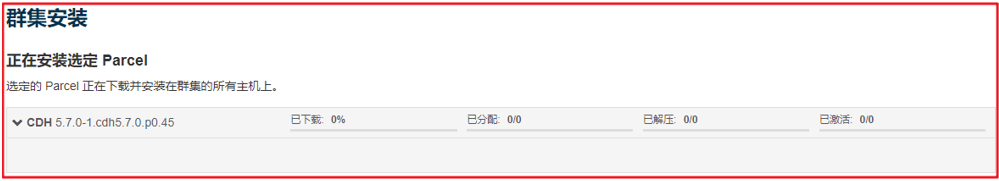 6. 安装选定Parcel,先前配置的Parcel就作用于此处,如果不进行此配置会去官网进行下载,对网络要求很高,并网络中断后会重新下载,较麻烦,使用此配置可以直接下载成功,并速度很快: