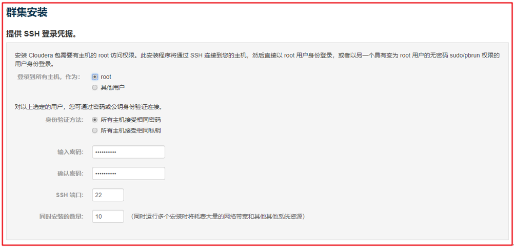 4. 提供 SSH 登录凭据,可以自由选择,这里直接使用root用户: