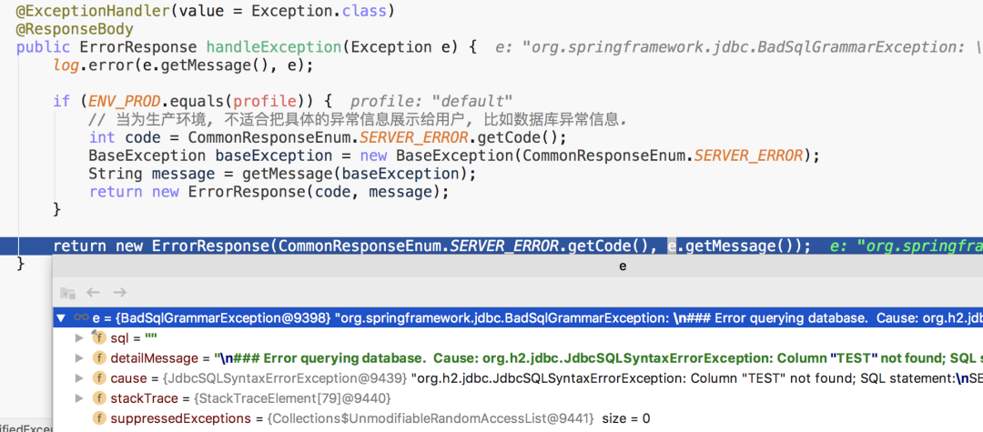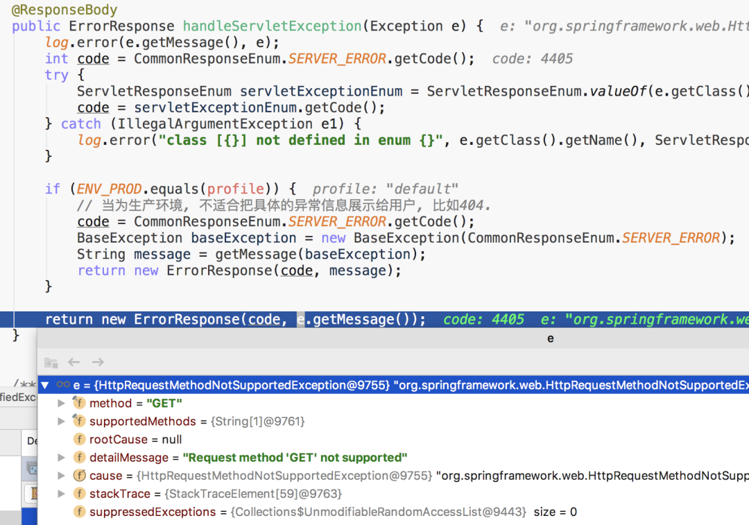 在生产环境,若捕获到 未知异常 或者 ServletException,因为都是一长串的异常信息,若直接展示给用户看,显得不够专业,于是,我们可以这样做:当检测到当前环境是生产环境,那么直接返回 "网络异常"。