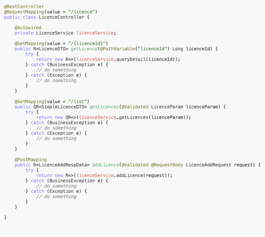 以后每增加一种异常情况,只需增加一个枚举实例即可,再也不用每一种异常都定义一个异常类了。然后再来看下如何使用,假设LicenceService有校验Licence是否存在的方法,如下: