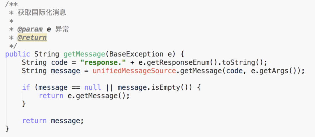 另外,当需要考虑国际化的时候,捕获异常后的异常信息一般不能直接返回,需要转换成对应的语言,不过本文已考虑到了这个,获取消息的时候已经做了国际化映射,逻辑如下: