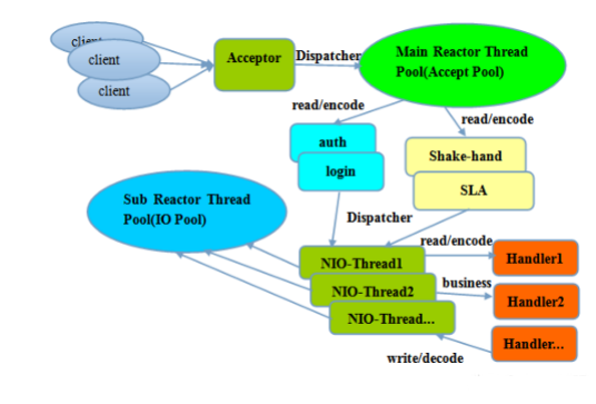 服务端用于接收客户端连接的不再是个 1 个单独的 NIO 线程,而是一个独立的 NIO 线程池。Acceptor 接收到客户端 TCP 连接请求处理完成后(可能包含接入认证等),将新创建的SocketChannel 注册到 IO 线程池(sub reactor 线程池)的某个 IO 线程上,由它负责SocketChannel 的读写和编解码工作。Acceptor 线程池仅仅只用于客户端的登陆、握手和安全认证,一旦链路建立成功,就将链路注册到后端 subReactor 线程池的 IO 线程上,由 IO 线程负责后续的 IO 操作。