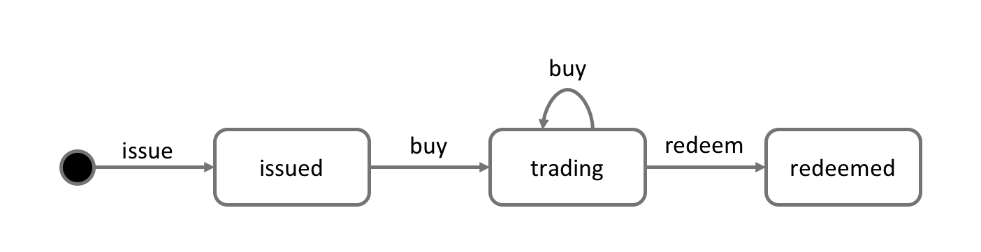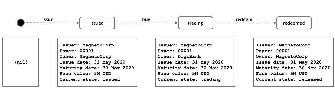 我们已经看到,票据00001的生命周期相对简单——它在发行、交易和因发行、购买或赎回交易而赎回之间移动。这三次交易由MagnetoCorp和DigiBank发起(两次),并驱动00001纸的状态变化。让我们更详细地看看影响本文的交易: