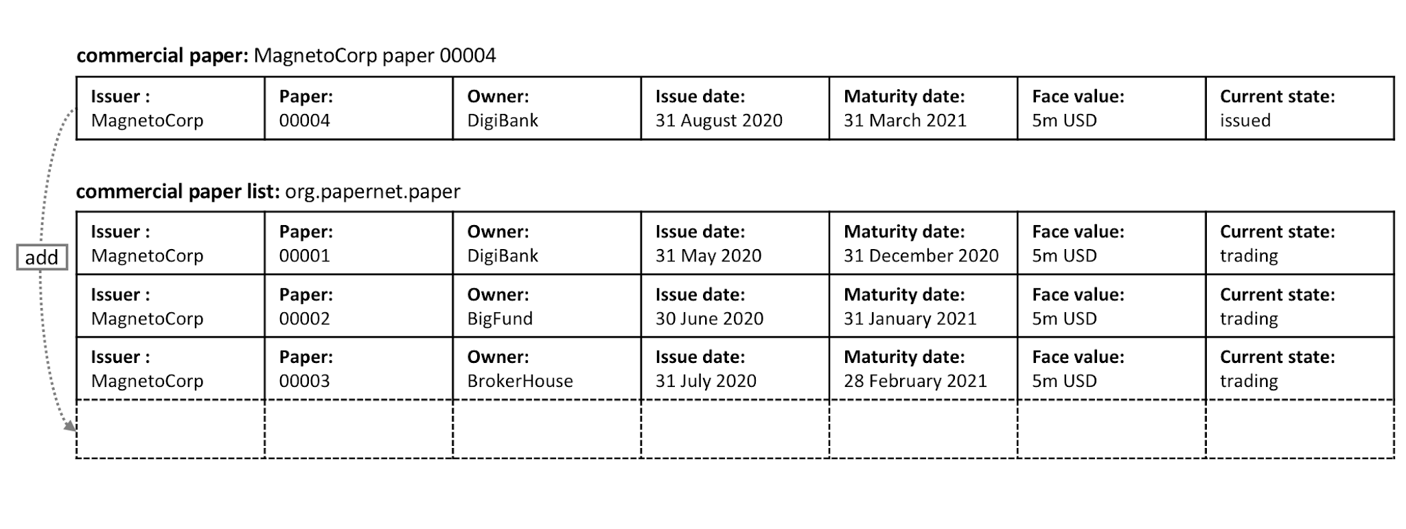 由于发行交易,新的票据可以添加到列表中,并且已经在列表中的票据可以通过购买或赎回交易更新。看看列表是如何使用描述性名称的:org.papernet.papers;使用这种DNS名称确实是个好主意,因为精心选择的名称会让区块链设计更直观。这一观点同样适用于聪明的合同名称。