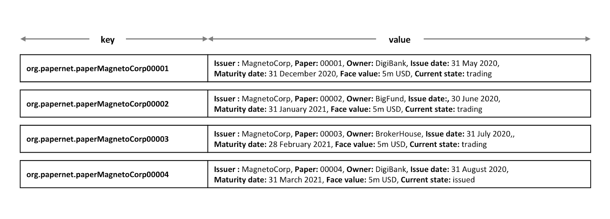 在大多数实际应用程序中,状态将具有在给定上下文中唯一标识它的属性组合——这是关键。商业票据的关键是由发行机构和票据属性的串联构成;MagnetoCorp的第一张票据是MagnetoCorp00001。