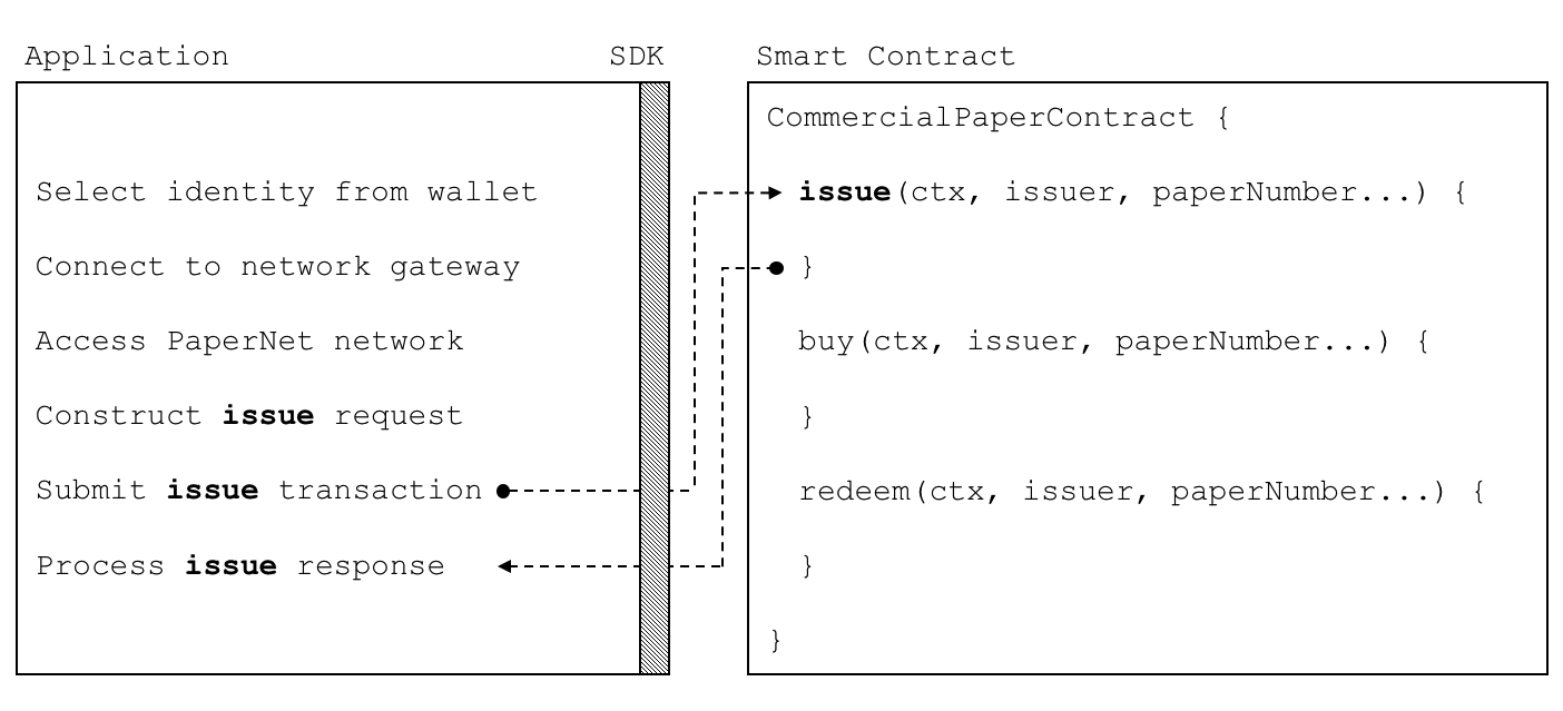 应用程序使用Fabric SDK与区块链网络交互。下面是一个应用程序如何调用商业票据智能合同的简化图: