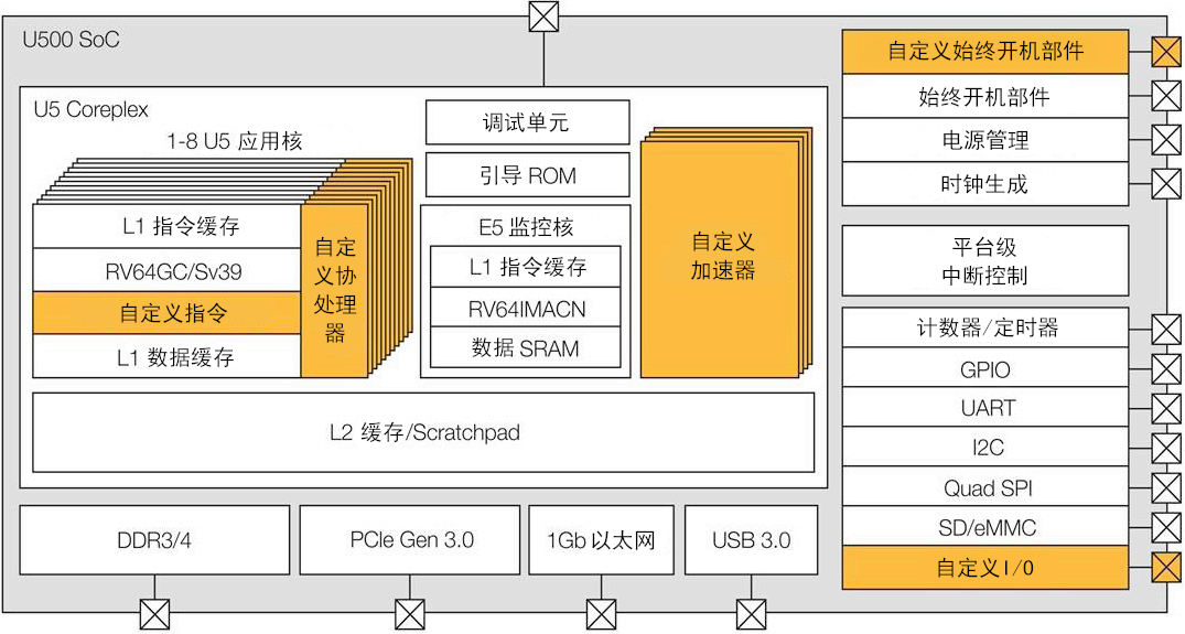 SiFive的Freedom 平台包含完整的软件规范、用于支持操作系统的板级支持包(BSP)、开发板和基础芯片,允许用户自行扩展/自定义芯片功能。Freedom U500系列多核RISC-V嵌入式应用处理器完全支持Linux,时钟速度为1.6 GHz或者更高。针对机器学习、存储和网络功能的需要,U500支持加速器和快取一致性,这使得处理器能够支持PCIe 3.0、USB 3.0、千兆以太网和DDR3/DDR4等高速外设。