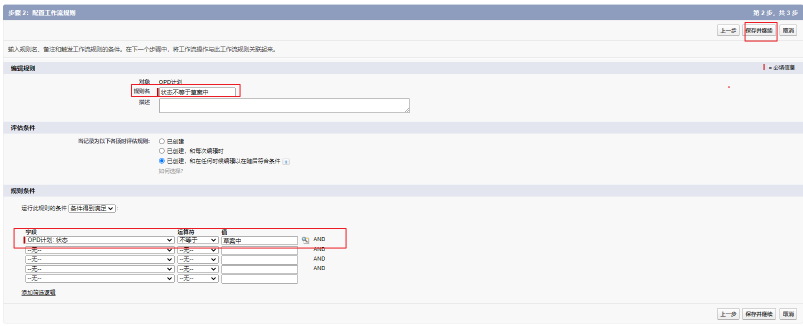 第2步: 设置工作流的名称以及什么标准条件下才会自动执行此工作流的动作