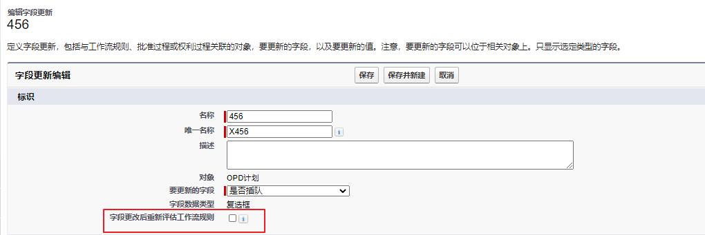 2.新的字段更新(New Field Update) :更新此工作流关联的sObject的字段值;