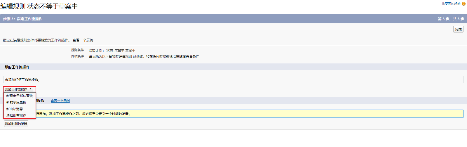 1. 评估条件 : 系统默认情况下选择第三种,即 当这条记录被创建或者被修改情况下校验下方校验规则,如果条件满足,则执行action,其中执行action部分还需要配置time trigger,这点在第三步加以描述。当选中第一种则只有当记录被创建时执行校验,选择第一种则这条记录最多只能执行一次workflow,选择第二种为每次添加或者修改操作时会执行下方校验,如果校验成功,则执行第三步的action,其中采用第二种方式则不需要配置time trigger,立即执行action操作。