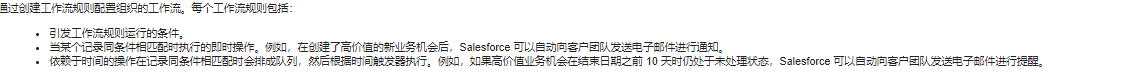 介绍一下salesforce中什么情况下使用workflow。当你分配许多任务,定期发送电子邮件,记录修改时,可以通过自动配置workflow来完成以上操作而不是手工做这些工作。
