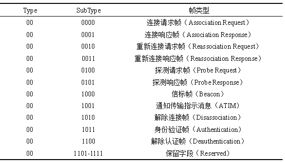 表1 管理帧及相应帧类型