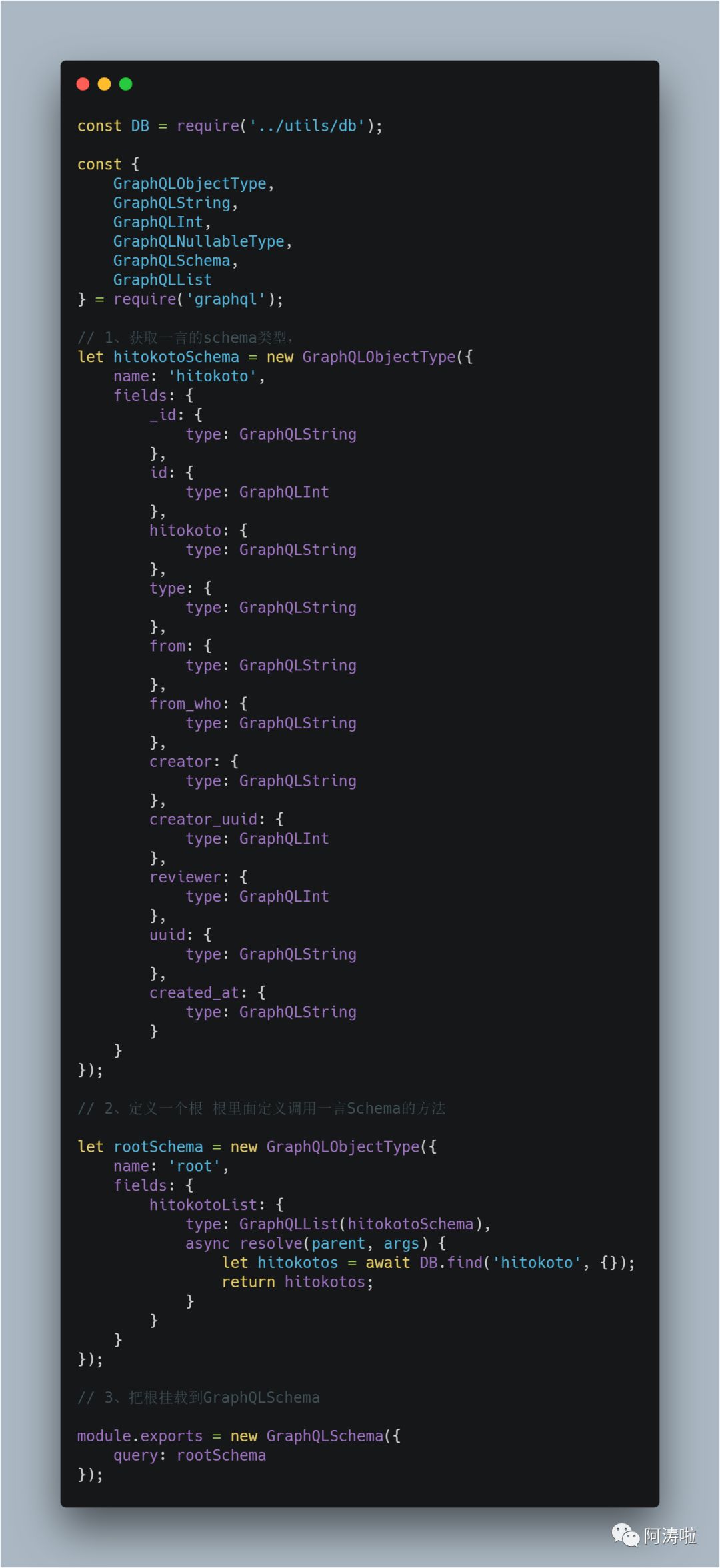 这里我们引入封装的DB工具模块,然后引入相应的graphql模块类型,然后我们还是和楼上一样创建一个一言的Schema,唯一不同的是我们不是用buildSchema,然后定义一个根,这里根楼上不一样的是,它这边会有多条数据所以放到GraphQLList里面,异步的话Promise,fun*,async你随便吧,我这里选择async,最后给它输出出去。