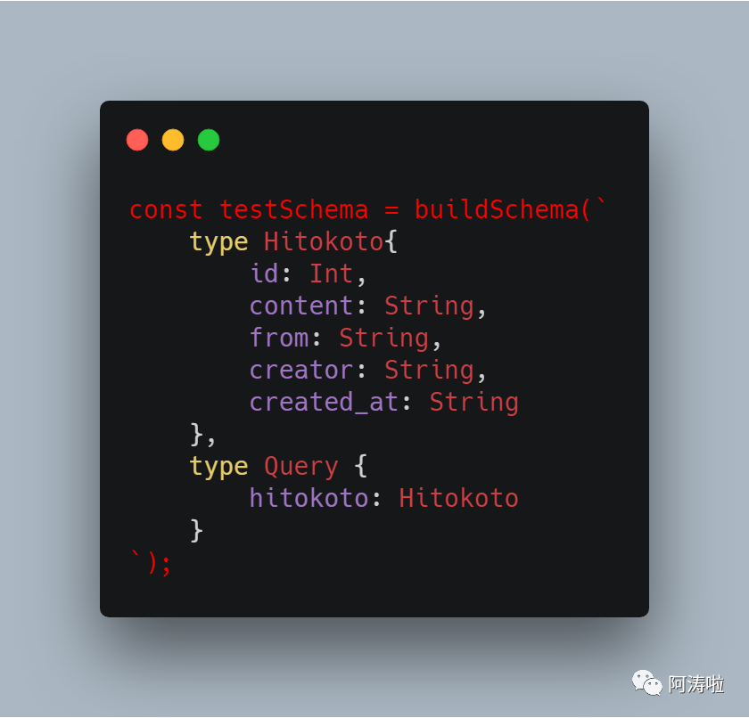 我们创建一个Schema叫testSchema,然后写个低配版的一言的例子,然后创建一个查询方法,返回我们创建的一言对象类型。