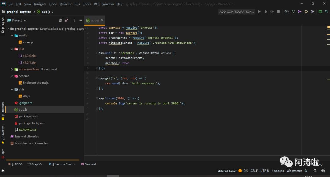 其中,config文件夹下是一些数据配置文件,然后dist文件夹是基于git进行版本控制输出的tag,对,这里可能用tag更应景一点。node_modules就是node安装的模块,然后schema下面就是楼上的定义模型,utils包下是一些通用工具类,这里看名字也该知道是封装好的基于mongodb的库,app.js就是入口文件啦,.gitignore文件就是把一些不要进行版本控制的文件给排除,这里就是node_modules不高兴放上去,package.json以及带lock的那位就是基于npm的包管理配置文件,README.md就是写的说明文档啦,介绍完毕。
