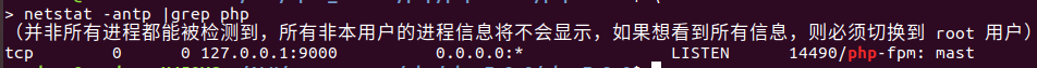 netstat -antp | grep php 即可看见 php-fpm 进程在运行(fpm进程默认使用 9000 端口):