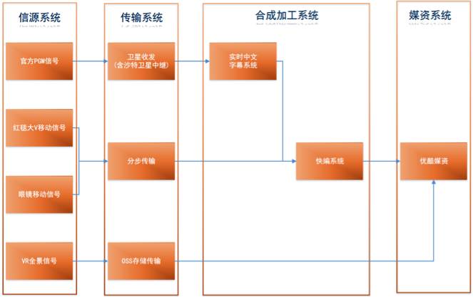 无压缩广播级专业高清标准文件的体量巨大,在单位时间内无法进行互联网带宽的高压传输。为此优酷对于高清视频画面进行了分布式编码,从而避免丢包带来的画面精度流失。简单的来说就是将一幅画面平均分成9等分,每个1/9的画面通过一张4G卡进行传输,画面抵达中国后在通过软件的方式将9个1/9画面进行拼合。