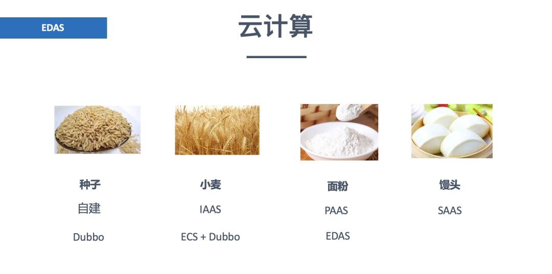 但大家都知道,在现实生活中,“种子”变成“小麦”一般是农民伯伯的活,应该很少有人会因为想吃一个馒头,而去播撒一波种子的。例如很多互联网创业公司肯定接受不了这种玩法,想要尽快落地产品,第一步一定不是搞一堆机器,于是 IaaS 成了他们的救星,很多云计算公司提供了云服务器(ECS),解决了基础硬件问题,剩下的东西研发工程师都能搞定,所以“我有一个很好的 idea,就差一个程序员了”就变得流行了起来。在 IaaS 阶段,可以用 ECS 部署数据库,部署 Redis,部署 Dubbo 节点,机器出了问题可以提工单给云厂商,大大减少了运维成本,可以让研发人员更加专注在业务开发上。