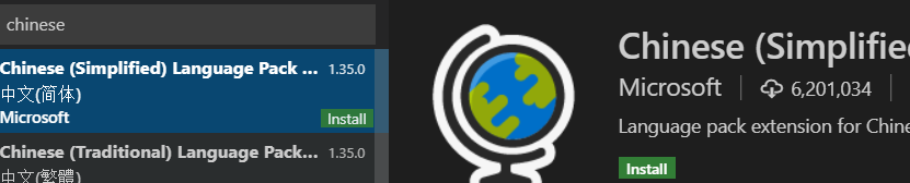 如果需要汉化,ctrl + shift + x,打开插件商店,输入 chinese,然后选择第一个,点击 ‘install’