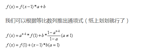 44 b=(b*(qmod(a,m.pow-1)-1)%mod*qmod(a-1,mod-2)%mod*c%mod+d)%mod;
