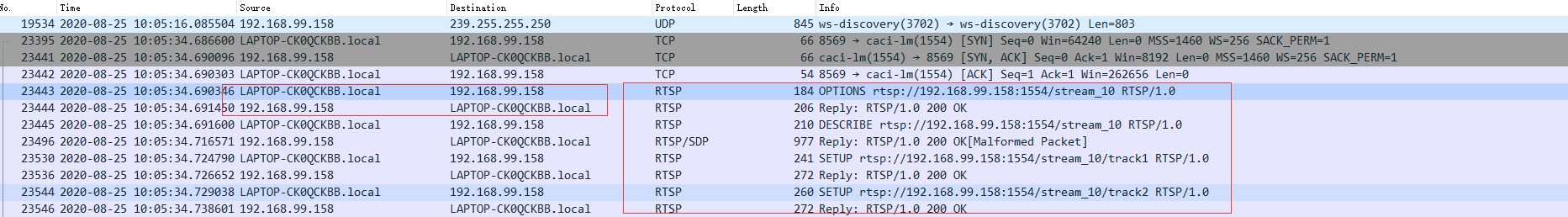 随后系统会重新扫描wireshark包,扫描完成后就可以看到RTSP包了,如下图所示: