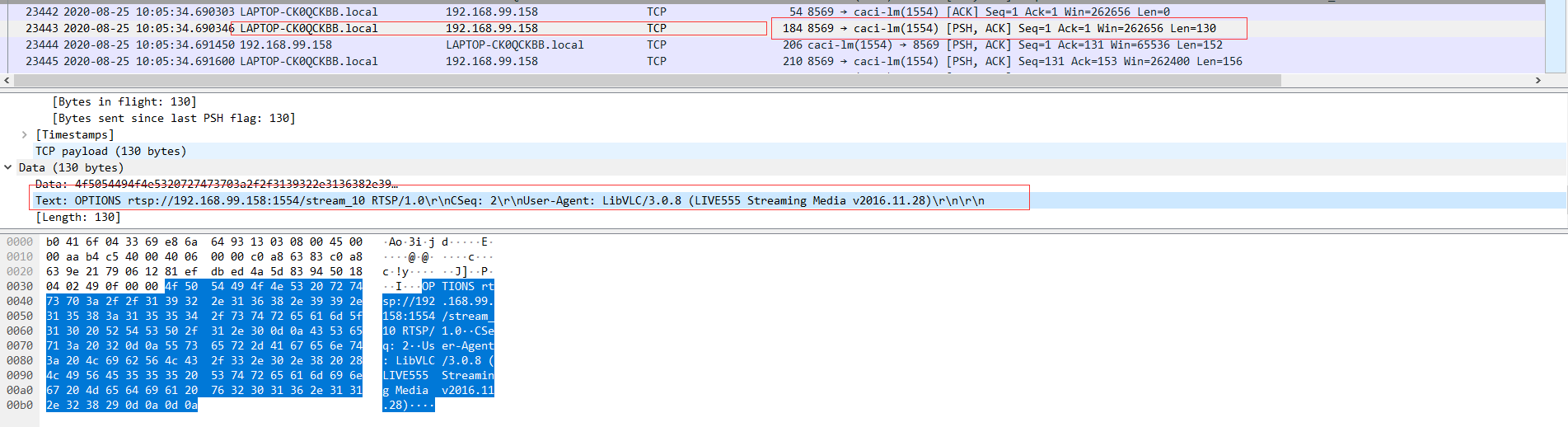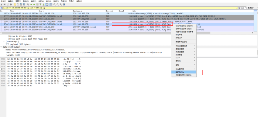 数据包内容显示是RTSP协议包,但是wireshark中的Protocol并没有识别出是RTSP协议,仅仅显示了TCP,针对此现象,我们可以通过wireshark的解包功能,进行重新解包。