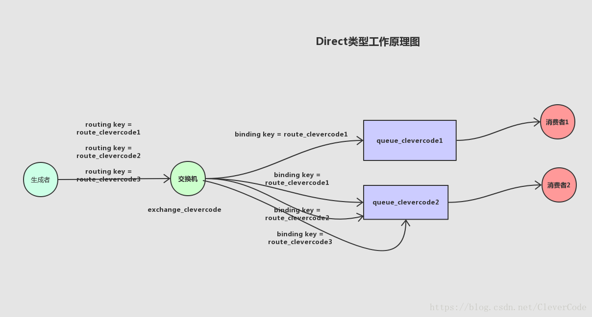 我们将会使用direct类型的交换器(exchange)来代替。路由的算法很简单——交换器将会对binding key和routing key进行精确匹配,