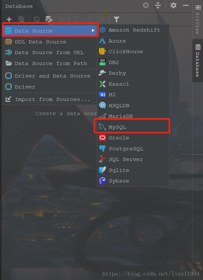 2、 点击database中的“+”, 选择Data Source, 选择MySQL