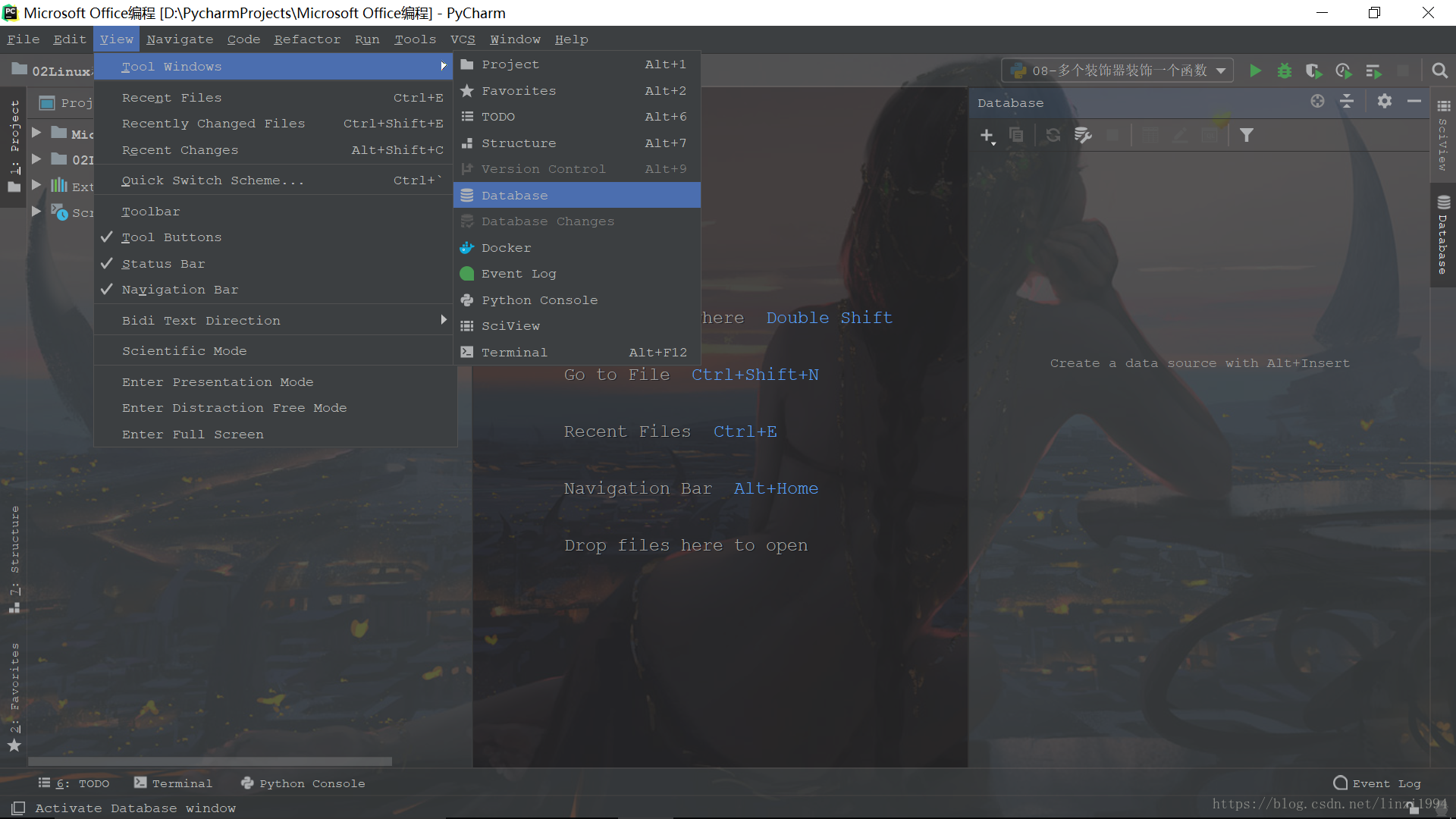 1、 在PyCharm右侧工具栏有Database,点击打开如果没有,则在导航栏点击view ---->Tool Windows ---->Database 选择显示