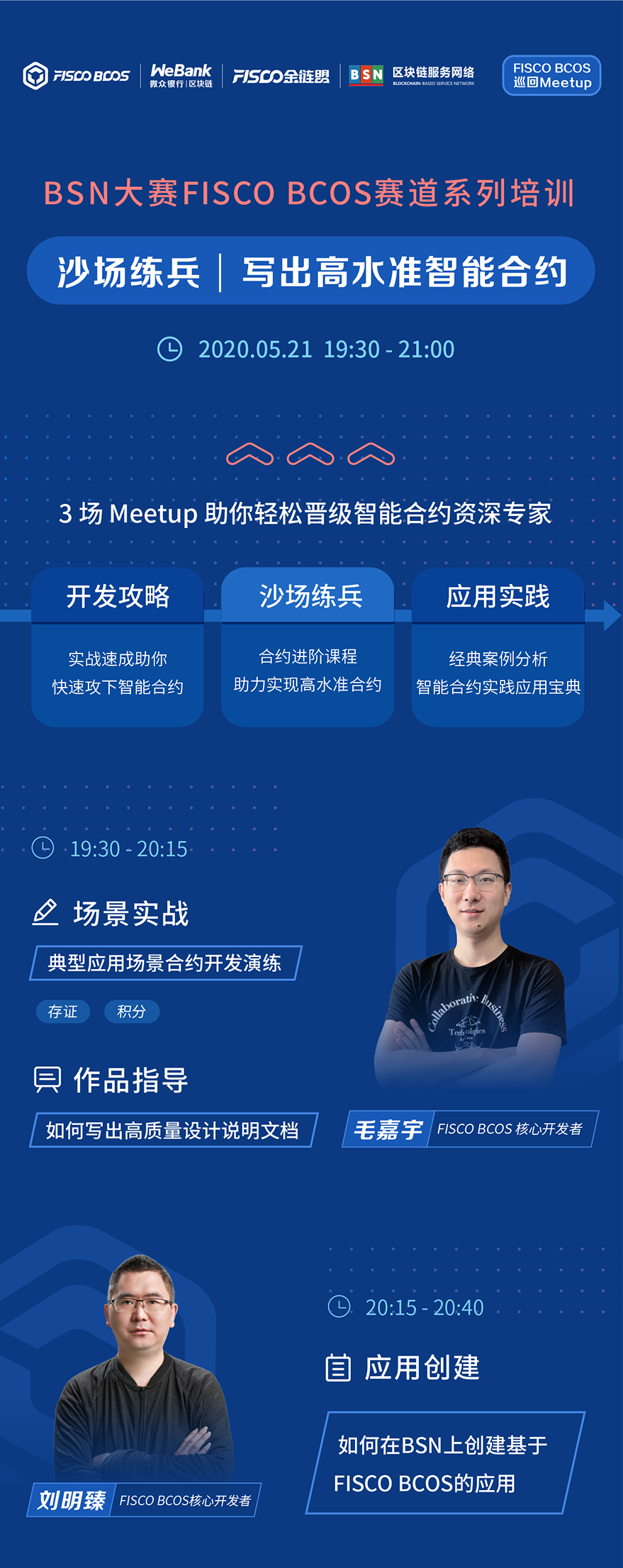为了对BSN第二次开发者大赛参赛选手提供针对性的智能合约开发指导,助力参赛者更好实现高质量的智能合约,FISCO BCOS开源社区巡回Meetup联合大赛相关单位,推出智能合约专场培训,以三场视频直播,帮助大家解决在智能合约开发过程中遇到的问题。