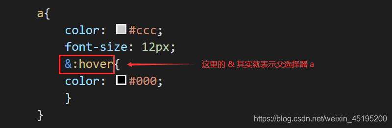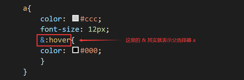 上图中 & 符号被解析为选择器 a,即父选择器。一般 & 符号是出现在选择器的前面位置,例如上述代码中的 &:hover。