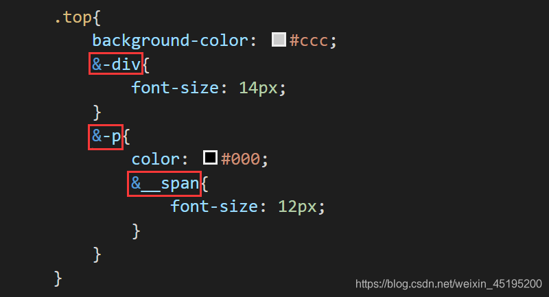 除此之外,我们也可以在 & 符号后面添加一些后缀,表示在父选择器名称的基础上组合成新的选择器名称。