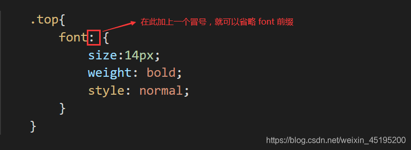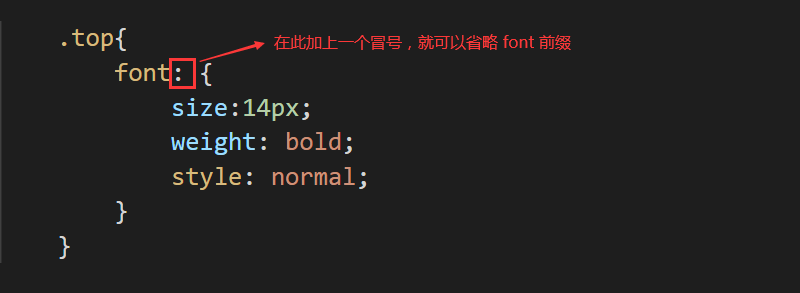 例如上面这段代码中,如果我们使用 Sass 来写,只需要在 .top 选择器中,在 font 命名空间后面加上一个 : 冒号,然后将其他属性使用花括号括起来,里面的属性就可以不用写 font- 前缀部分了。如下图: