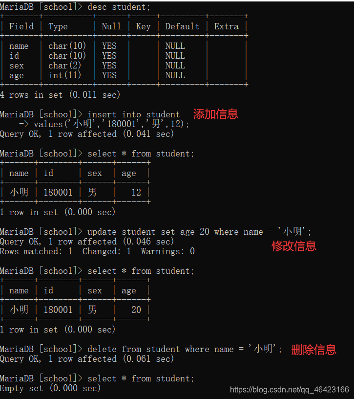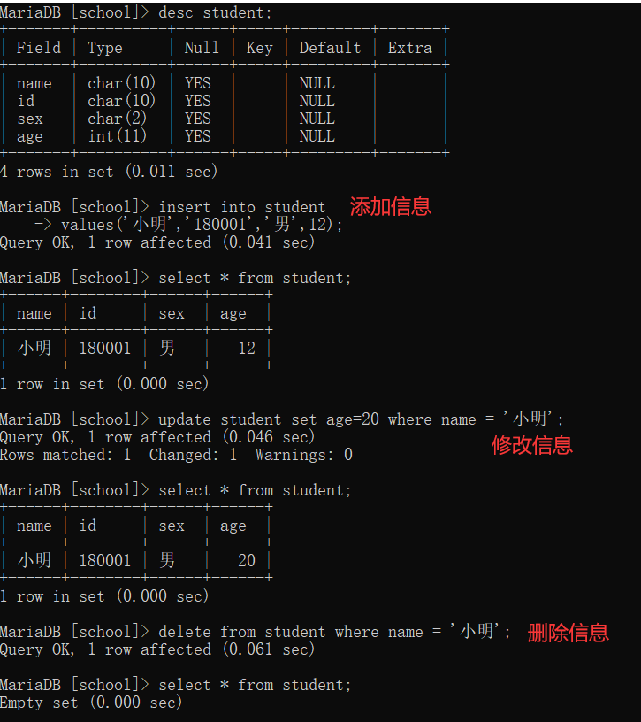 describe student; 或者直接用 desc student;