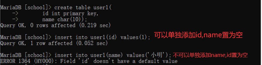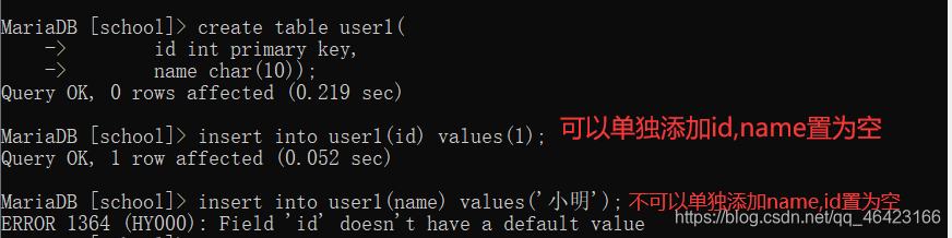 name char(10));alter table user3 add primary key(id);
