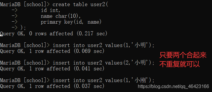 作用:联合主键就是用2个或2个以上的字段组成主键。