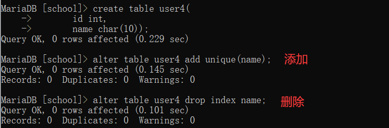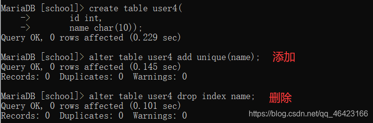 name char(10));alter table user4 add unique(name);