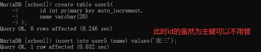 );insert into user5 (name) values('张三');