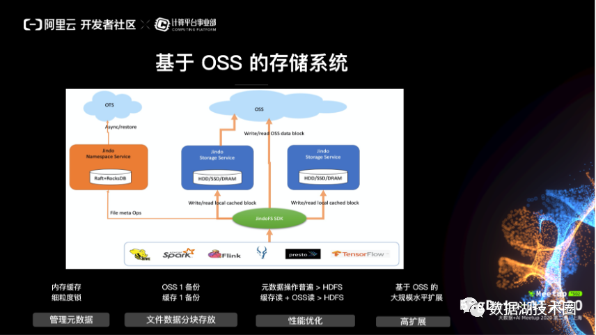 第四,和计算打通优化的能力。支持,和 JindoFS co-design 的 JindoTable 提供对数仓表的缓存、计算加速、治理优化和归档存储支持。