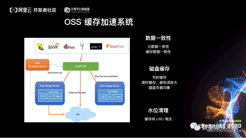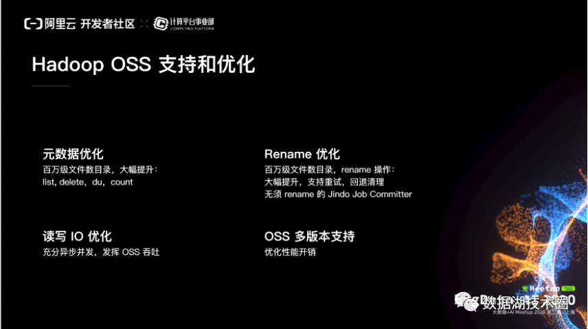 第一个事情就是说,我们是基于阿里云 OSS ,就是面向 Hadoop , Spark 和 AI 的生态,做了这样的一个 SDK ,然后是优化版本的。我们知道 Hadoop 是具有 OSS 的支持的,我们为什么要做一个新的。简单来讲,就是说我们要做好优化。首先,我们要做好元数据操作的优化,特别是对于大目录要做好优化。另外一个就是 Rename 优化。我们知道对象存储一个关键的元数据操作就是目录的 rename 操作,它是一个非常大的挑战,这是对象存储的本质决定的。因为对象存储不是文件系统,它其实没有目录的概念,它的目录完全是模拟出来的。也就是说,你对一个目录进行操作,就必须要对成千上万个对象相应的进行操作来模拟。甚至是说,在一些计算场景里面,是不是能够做到跳过 rename 。另外一个是读写 IO 优化,能不能够充分的利用好对象存储带来的水平扩展的这样一个能力,来做好lO的优化。最后, OSS 的多版本,或者 OSS 的归档,我们是不是能够支持。以上是我们第一个层面的工作。
