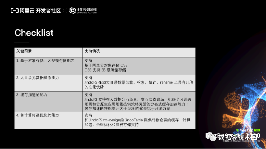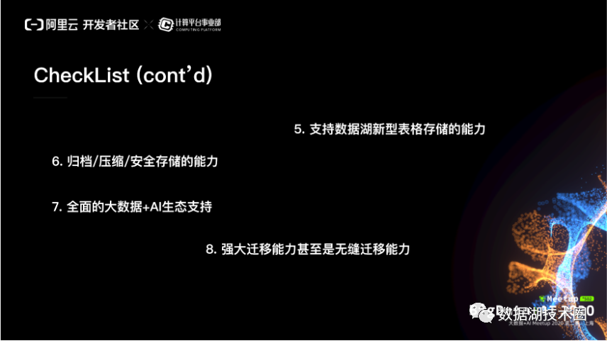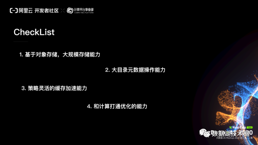 以上就是作为一个理想的数据湖的存储、加速方案,最好具备的一个 checklist 。考虑升级到数据湖架构的这样一些架构师可以对照一下这个 checklist ,来做方案的选型。