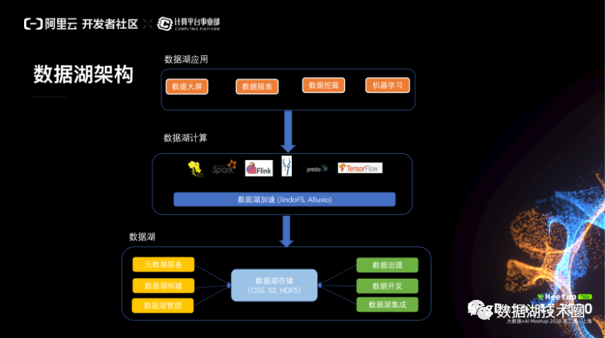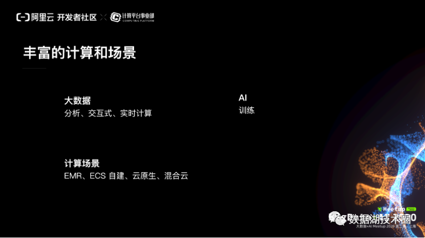 另外,在数据湖的整个的方案下面,要考虑到计算场景是非常丰富的,计算的环境也是错综复杂的。大数据,我们要支持分析、交互式、实时计算。然后 AI 有自己的各种各样的引擎来训练。