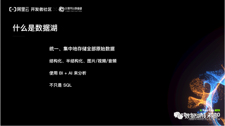 简单来讲,数据湖的理念就是说从一个企业的视角来讲,把整个数据集中的统一的存储在一起,主要通过 BI 和 AI 的手段来计算分析原始的数据。数据的类型不光是结构化、半结构化的,还包括音视频,这样的一些材料。
