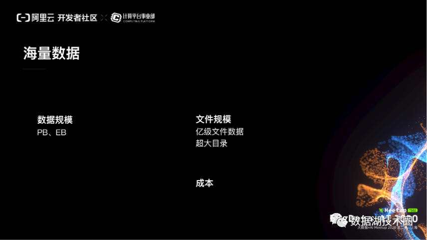 第一,最大的一个因素是数据量的问题。按照数据湖的理念,我们要把所有的数据全部都放在一起,那么在数据的规模上来讲是非常大的,数据规模可以膨胀到 PB、EB 级别。